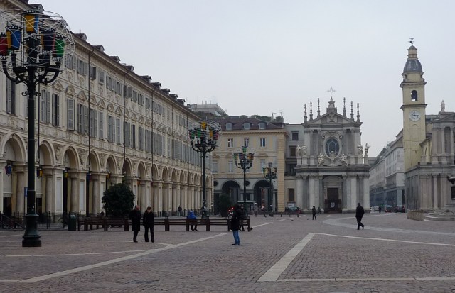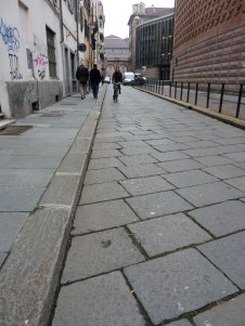 Just a little word or two more on the streets, and other things Italian. I’ll have pictures to go with this someday in another universe where computers do what the hell you tell them to. But for now, the streets, buildings, sidewalks, curbs in Torino are in granite, from the wildly decorated and enhanced to tiny (maybe 3″ square and one or two inches thick) cut granite cobbles and parts of cobbles used to fill in any irregular places. I had to laugh today, and stopped in the street to get a picture, when I realized that except in rare occasions, even the manhole and utility covers are delicately cut granite circles with even more delicate little vents. And drainpipes also seem to be generally used just for moving large quantities of effluent. Simple shallow troughs cut in the granite, or cut to fit between slabs, move surface water around.