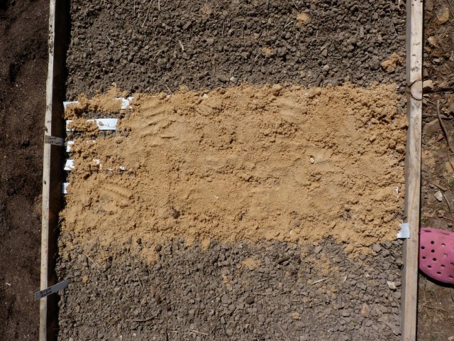 Seed tape. Laid out on the top of sifted soil and held down with dam sand. Each tape was labeled and markers put in at the end of the rows.