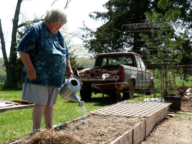 Watering in; a light covering of straw will break the fall of water and help keep the soil and seed tape moist. The lattice fit perfectly over the top of the bed as a further protection from marauding cats and one little dog who is learning the art of staying OUT of garden beds.