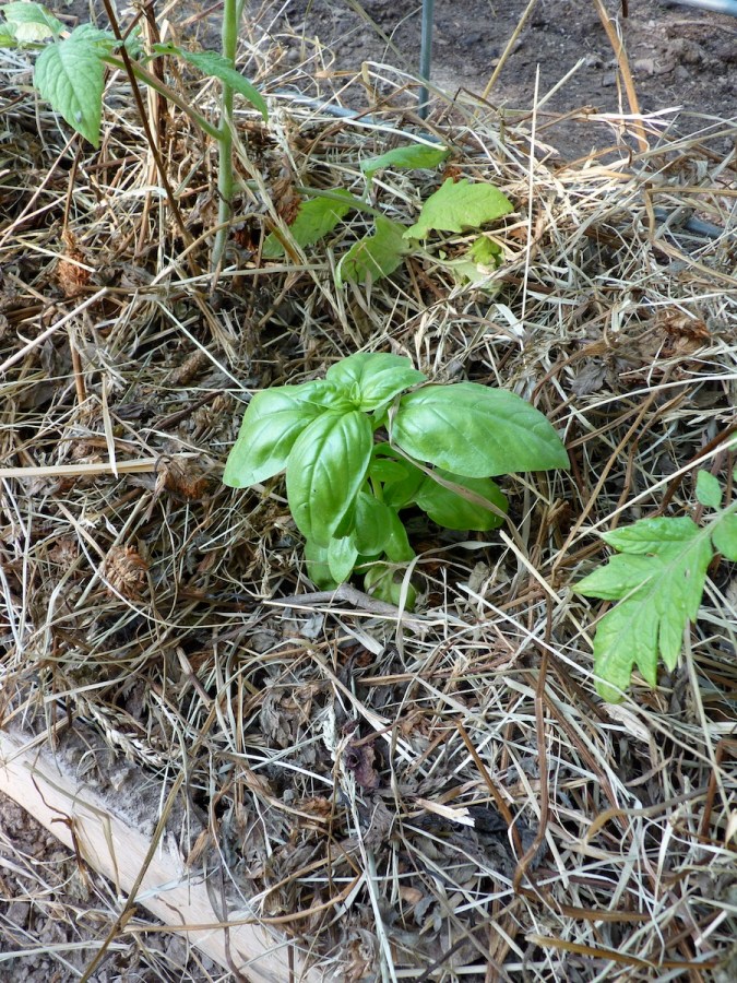 This row of tomatoes and basil has been mulched with a thick layer of very old hay. The basil is about ready to be pinched back for the first time.