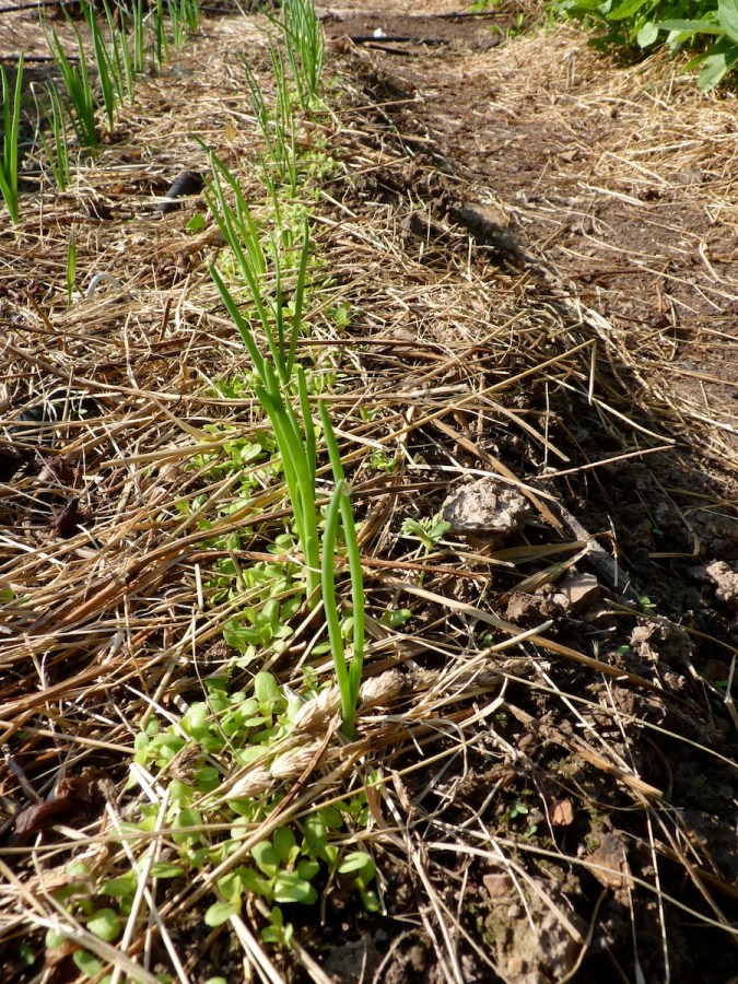 Rows of onions and lettuces tucked in between everything. Okra will soon pop up between these onions.