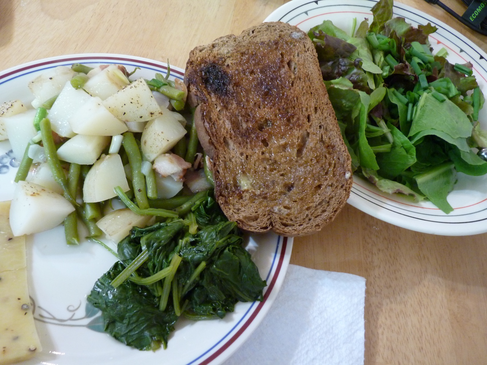 Here’s the whole meal ready to eat. Salad, beet greens and the potatoes with green beans. Everything picked just before it was prepared.