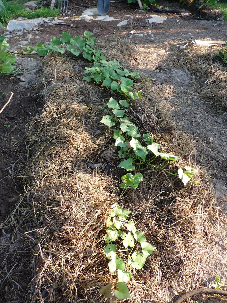 One of three beds with sweet potatoes. They aren’t taking off as well as I would like. This is the first time for either one of us to grow them.