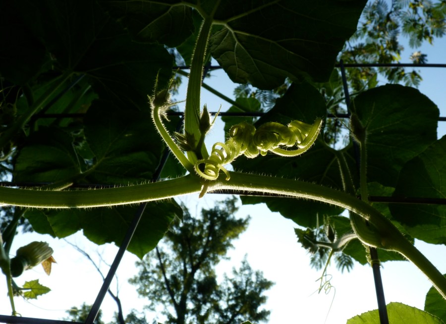 Looking up into the squash plants, the curly tendrils seek a hold to grab on to.